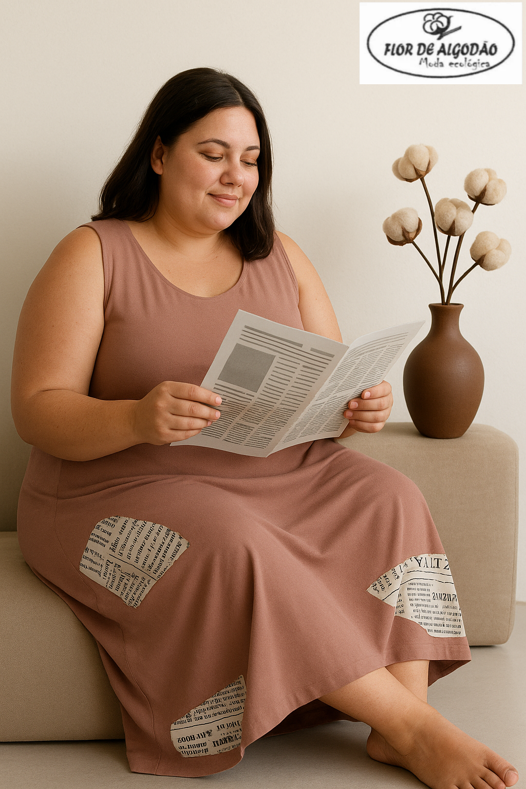 Feito à mão com algodão colorido natural e detalhes em patchwork de jornal, o vestido Entre Fatos e Fake traduz a essência da moda consciente e criativa.